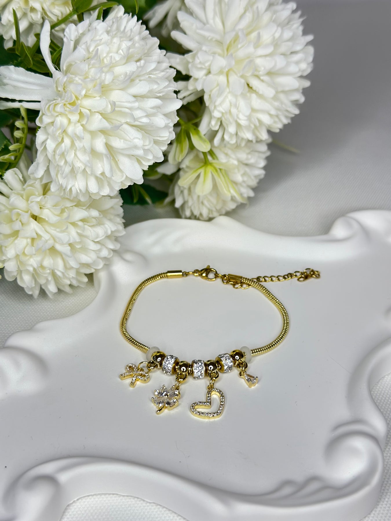 Kalp ve Çiçek Figürlü Charm Gold Çelik Bileklik