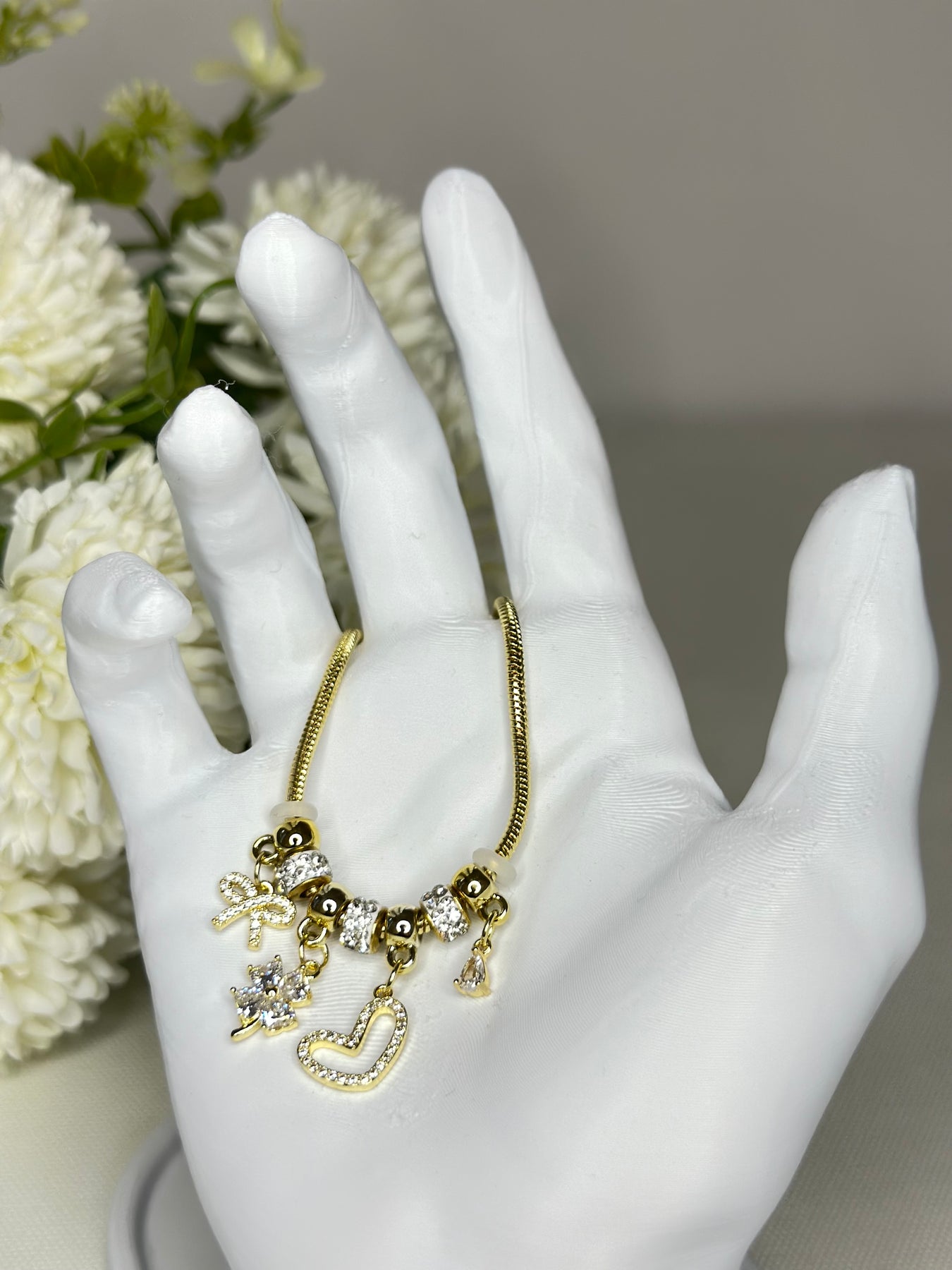 Kalp, çiçek ve sembol detaylarıyla zarif bir ışıltı sunan bu bileklik, gold tonunun sıcak duruşuyla feminen bir şıklık yaratır. Zirkon taşlı charm süslemeleriyle her stile ışıltılı bir dokunuş katar ve gün boyu parlaklığını korur.