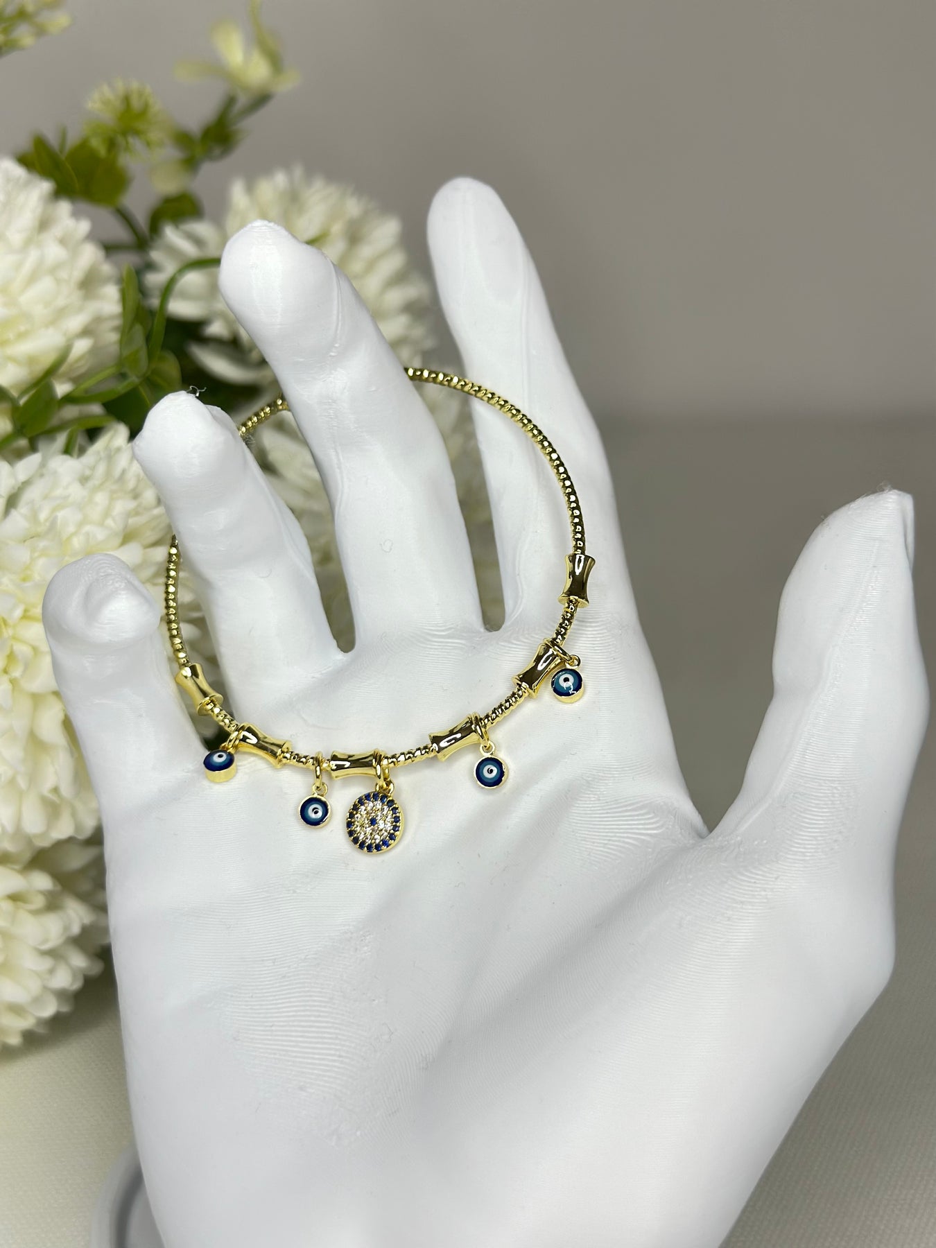 Mavi nazar boncuğu ve zirkon taş detaylarının birleşimiyle şık bir koruma sembolü sunan bu bileklik, gold tonunun zarif ışıltısıyla modern bir görünüm kazandırır. Hem günlük kullanıma hem özel gün kombinlerine anlamlı bir dokunuş ekler.