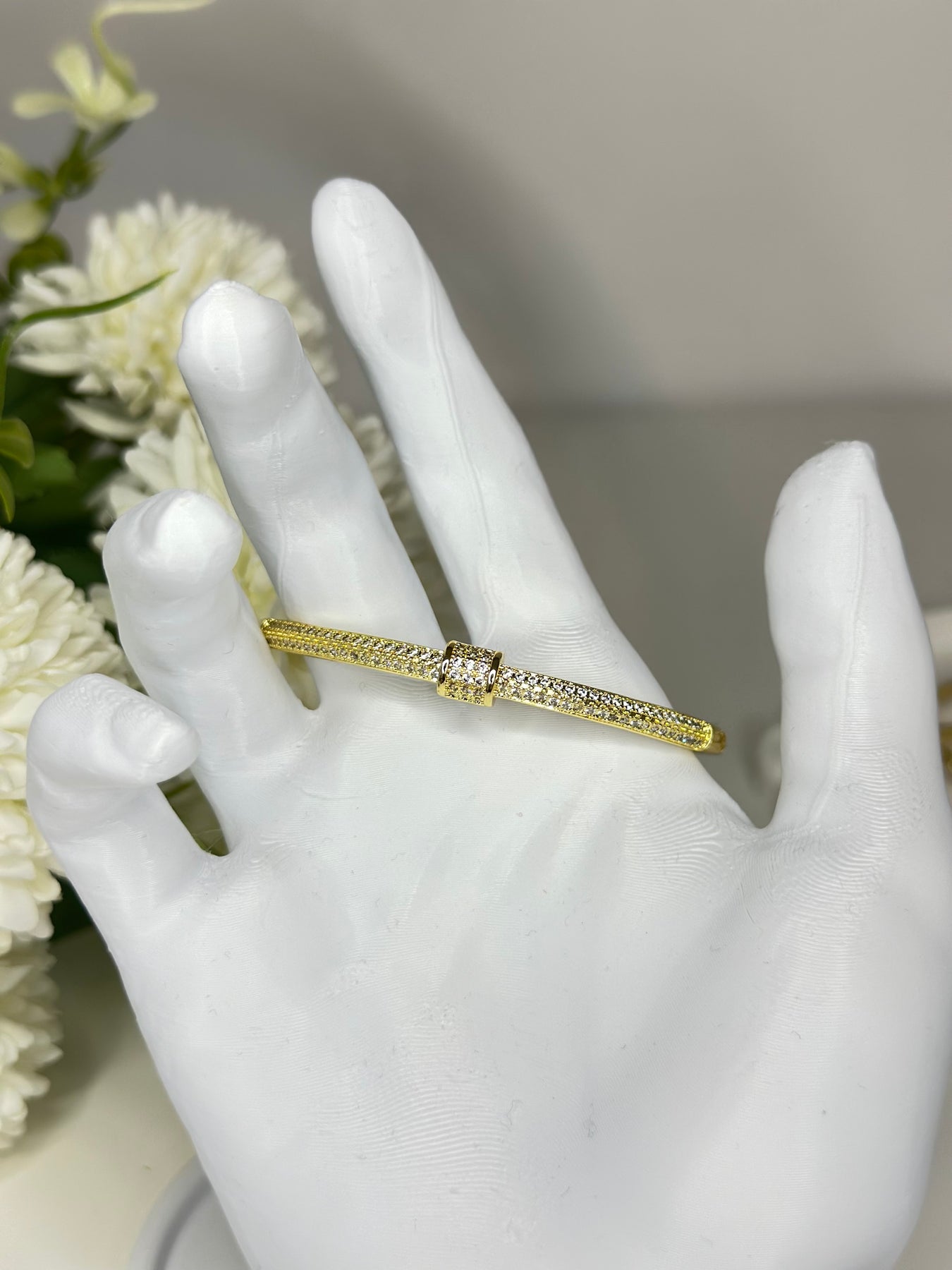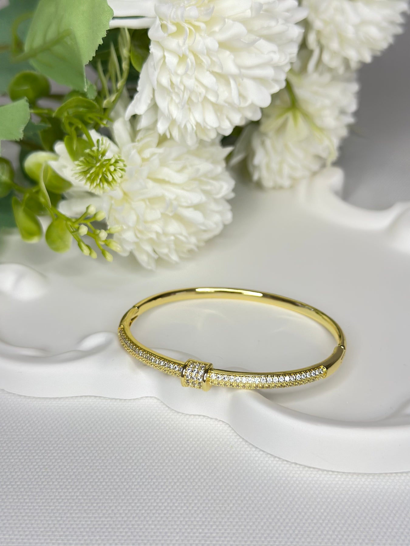 Minimal zarafetiyle öne çıkan bu kelepçe, ortasında yer alan halka formundaki taşlı detayla klasik ve modern çizgiyi birleştiriyor. Günlük kombinlerde zarif bir dokunuş, özel günlerde ise sade bir şıklık sağlar.