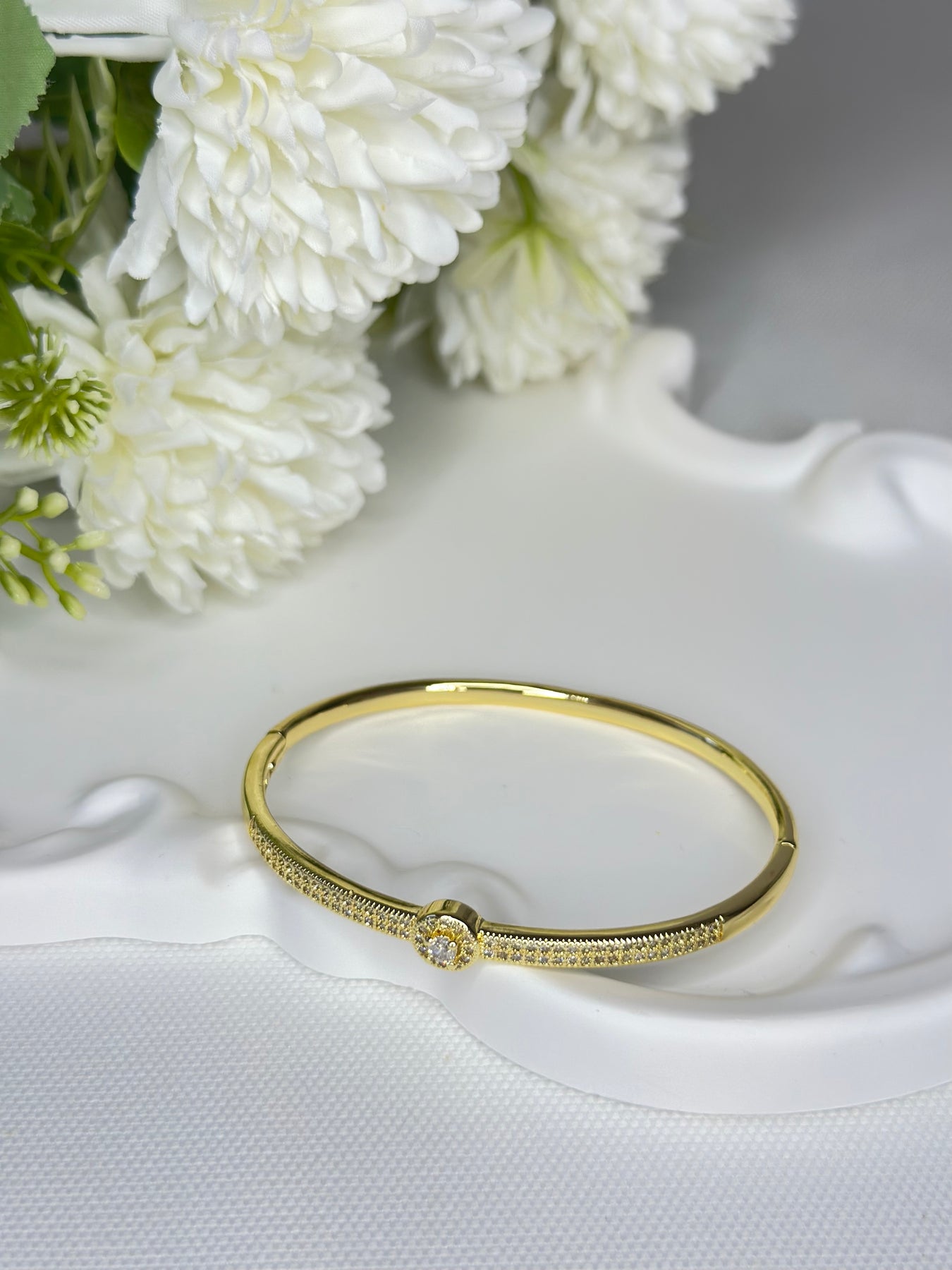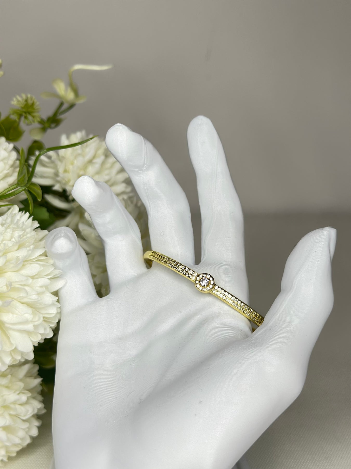 Zarif ve minimalist tasarımıyla öne çıkan bu kelepçe, merkezinde yer alan yuvarlak zirkon taş detayıyla ışıltılı bir şıklık sunar. İnce formu sayesinde zarif bir duruş sergiler ve günlük kombinlerden özel davetlere kadar her stile uyum sağlar.