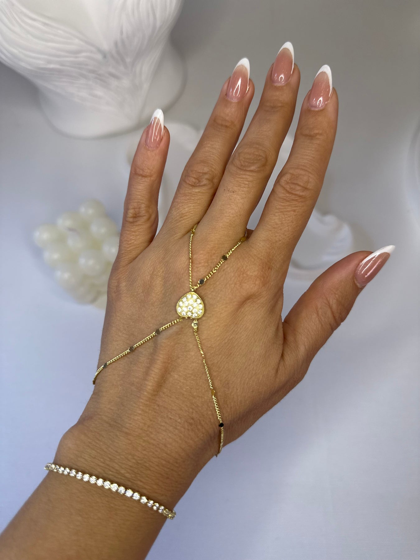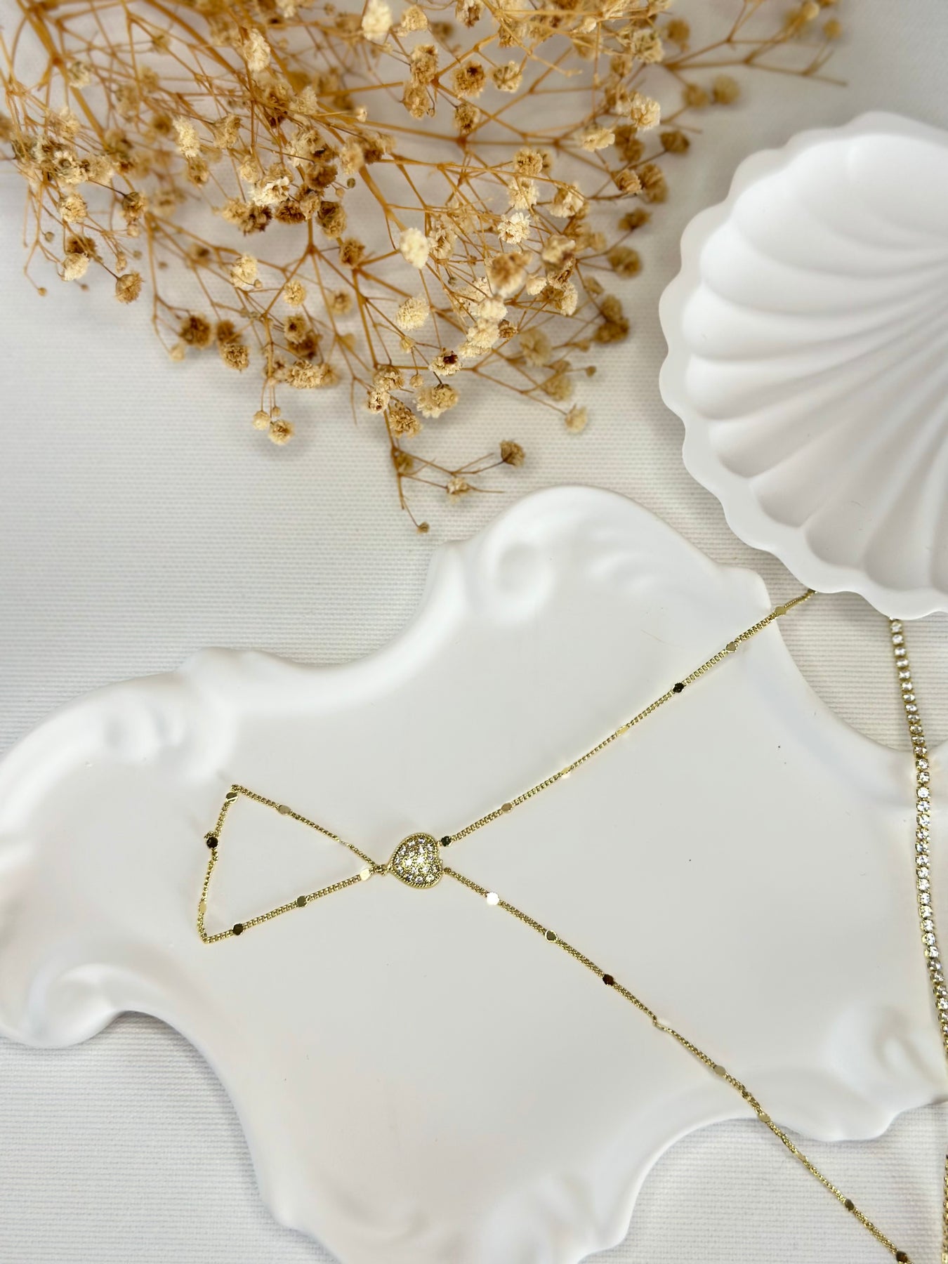 ✨ Detay: Yuvarlak taşlı merkez, ince zincir parmak bilezik tasarımı