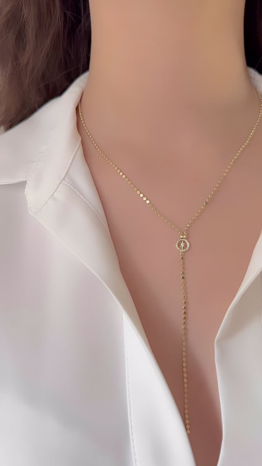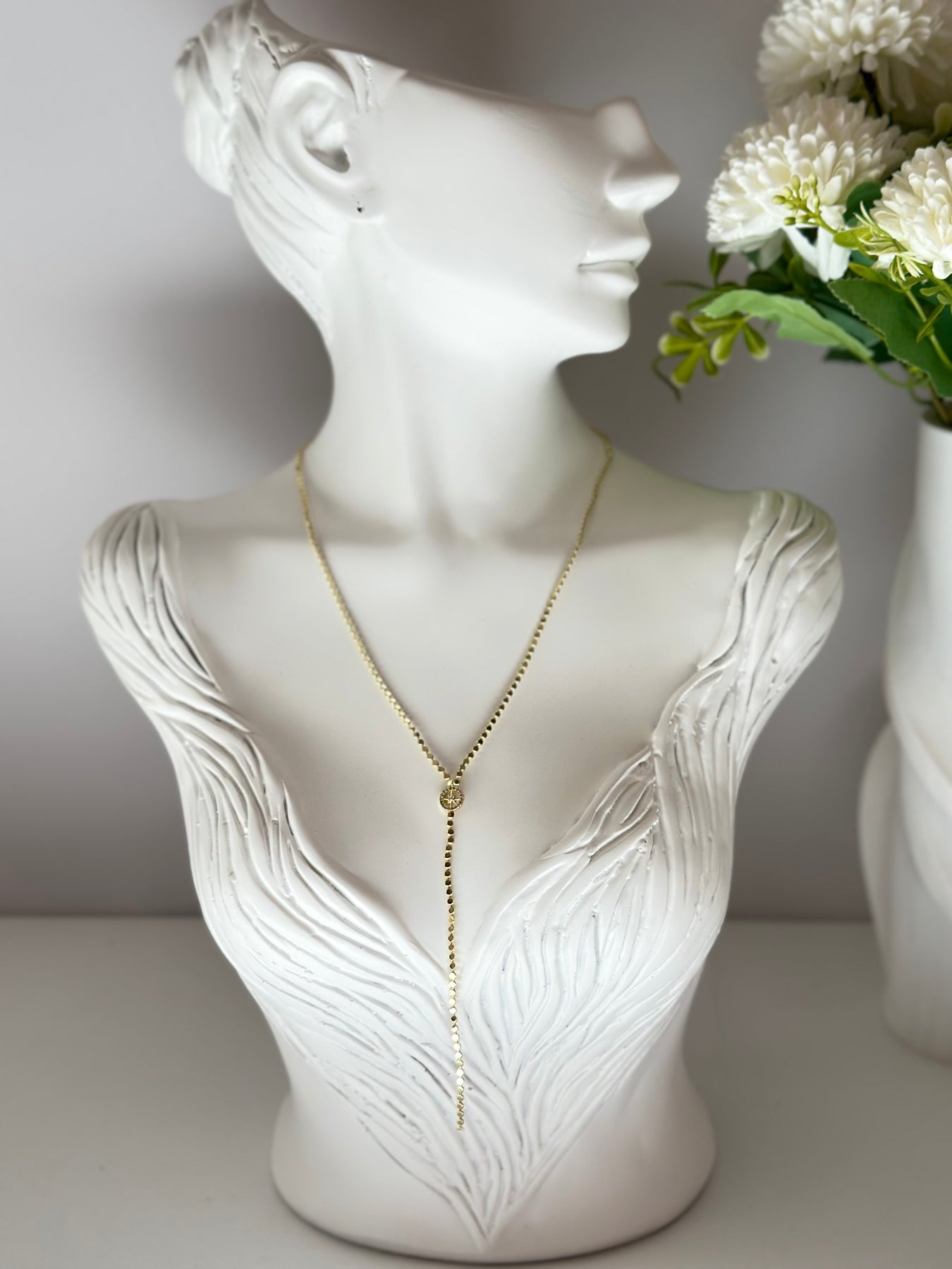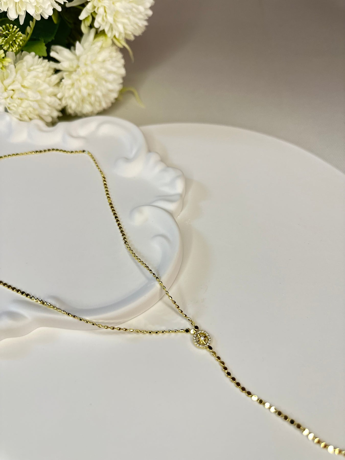 Zarif ve modern tasarımıyla öne çıkan bu kolye, ortasında yer alan taş detayı ve zincir uç formuyla göz kamaştırır. Altın tonlu parıltısıyla her kombinle mükemmel uyum sağlar.